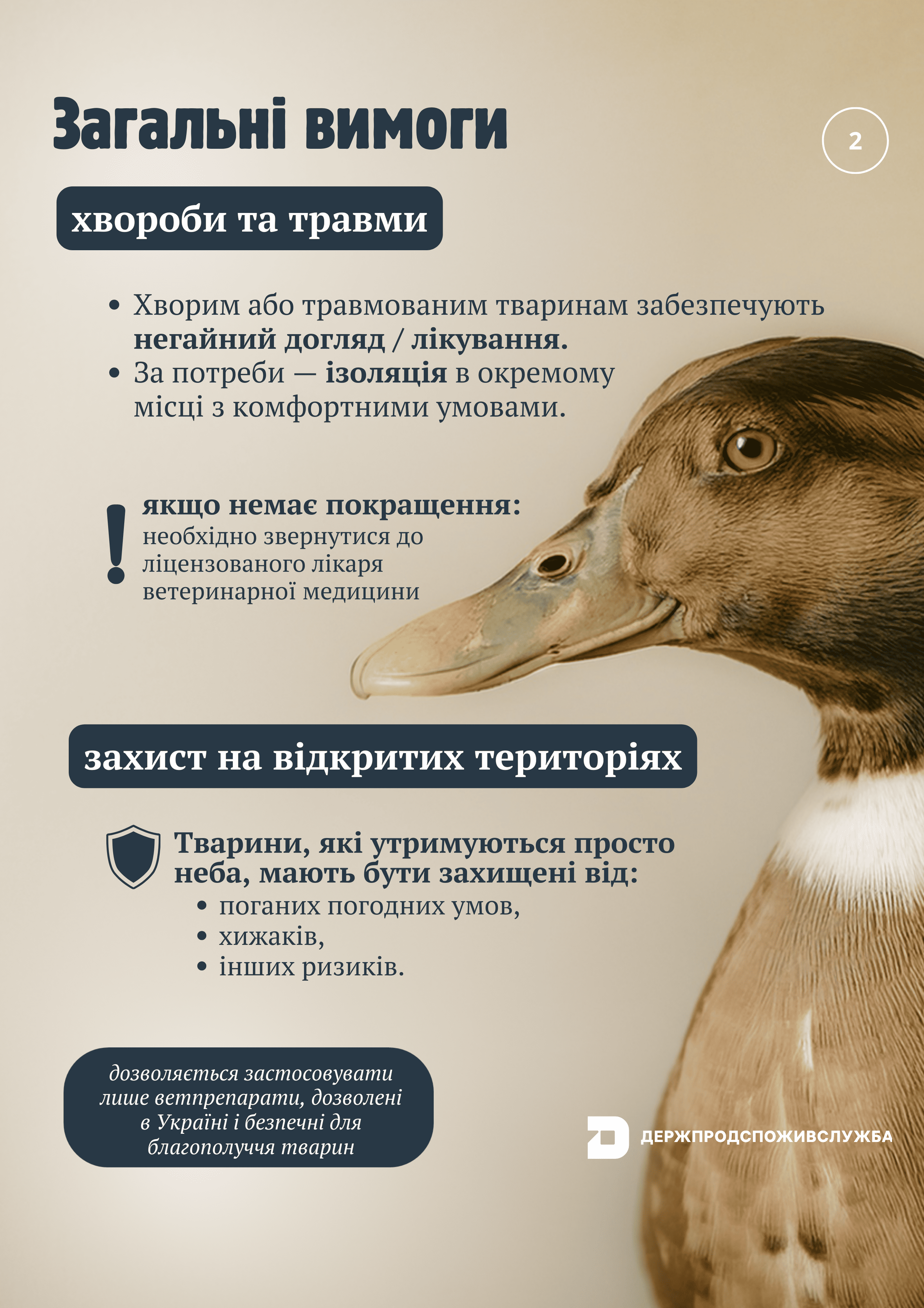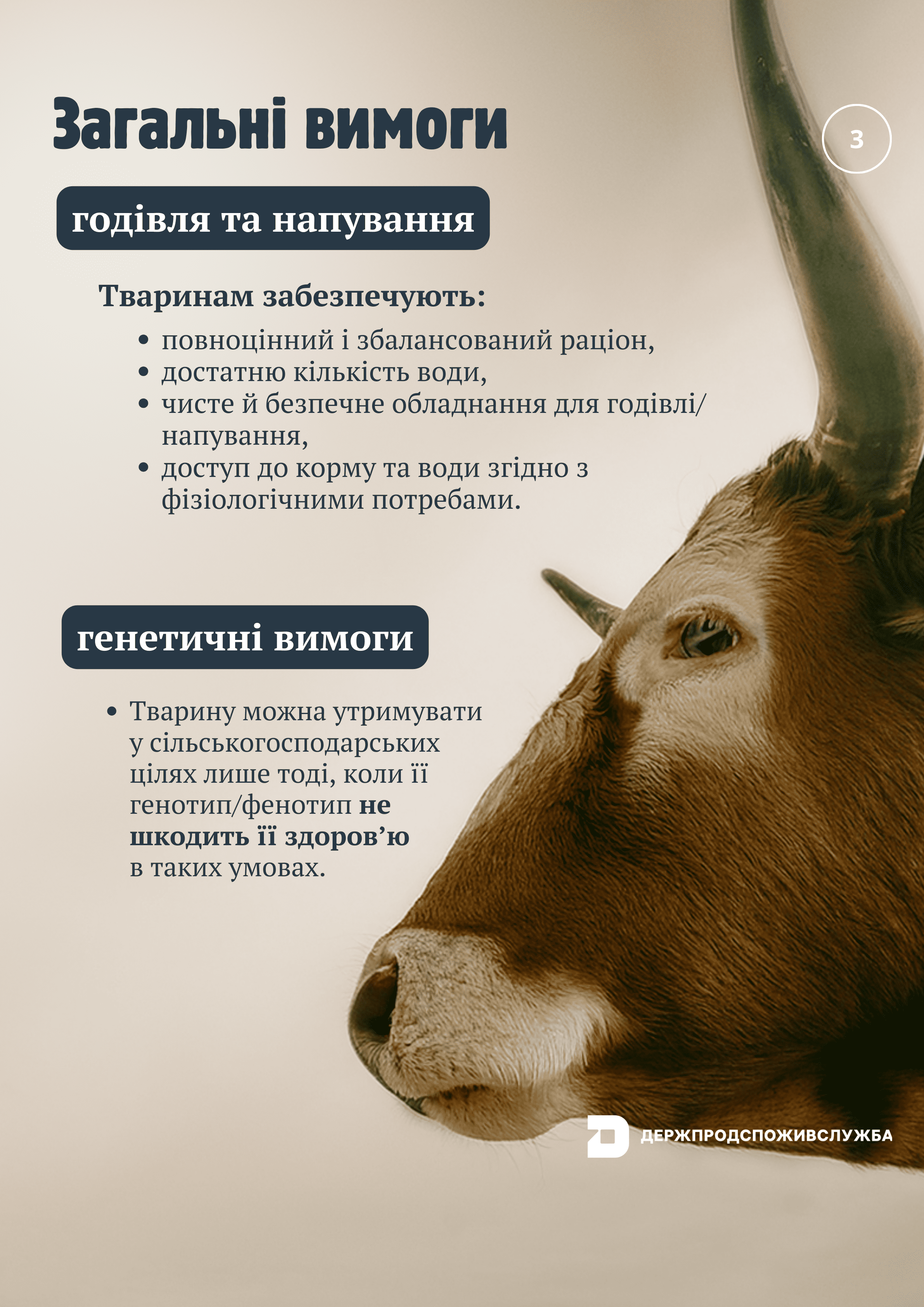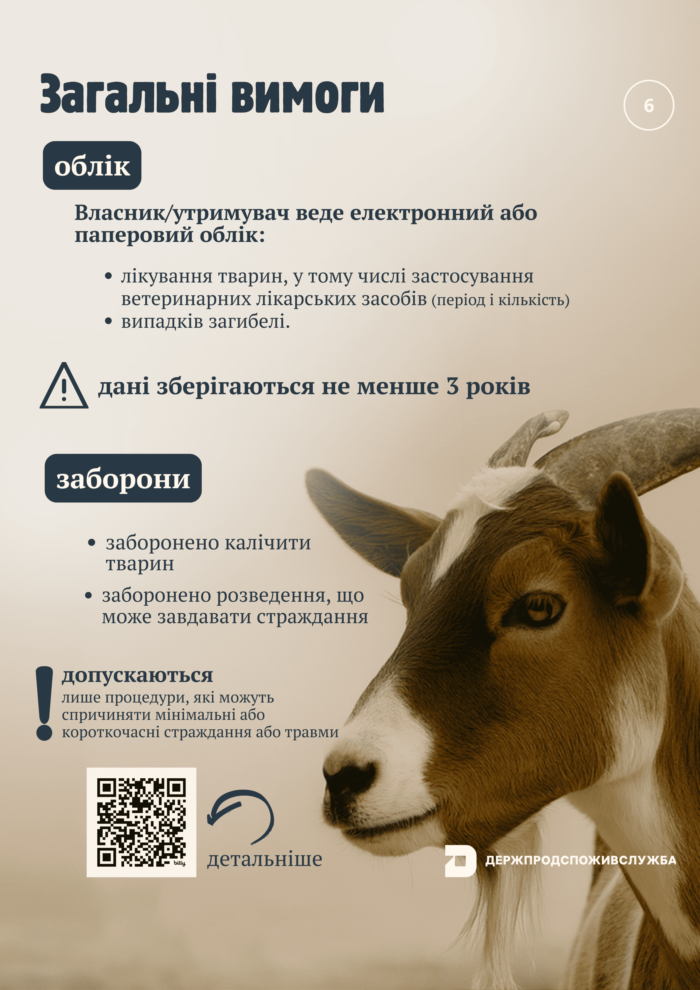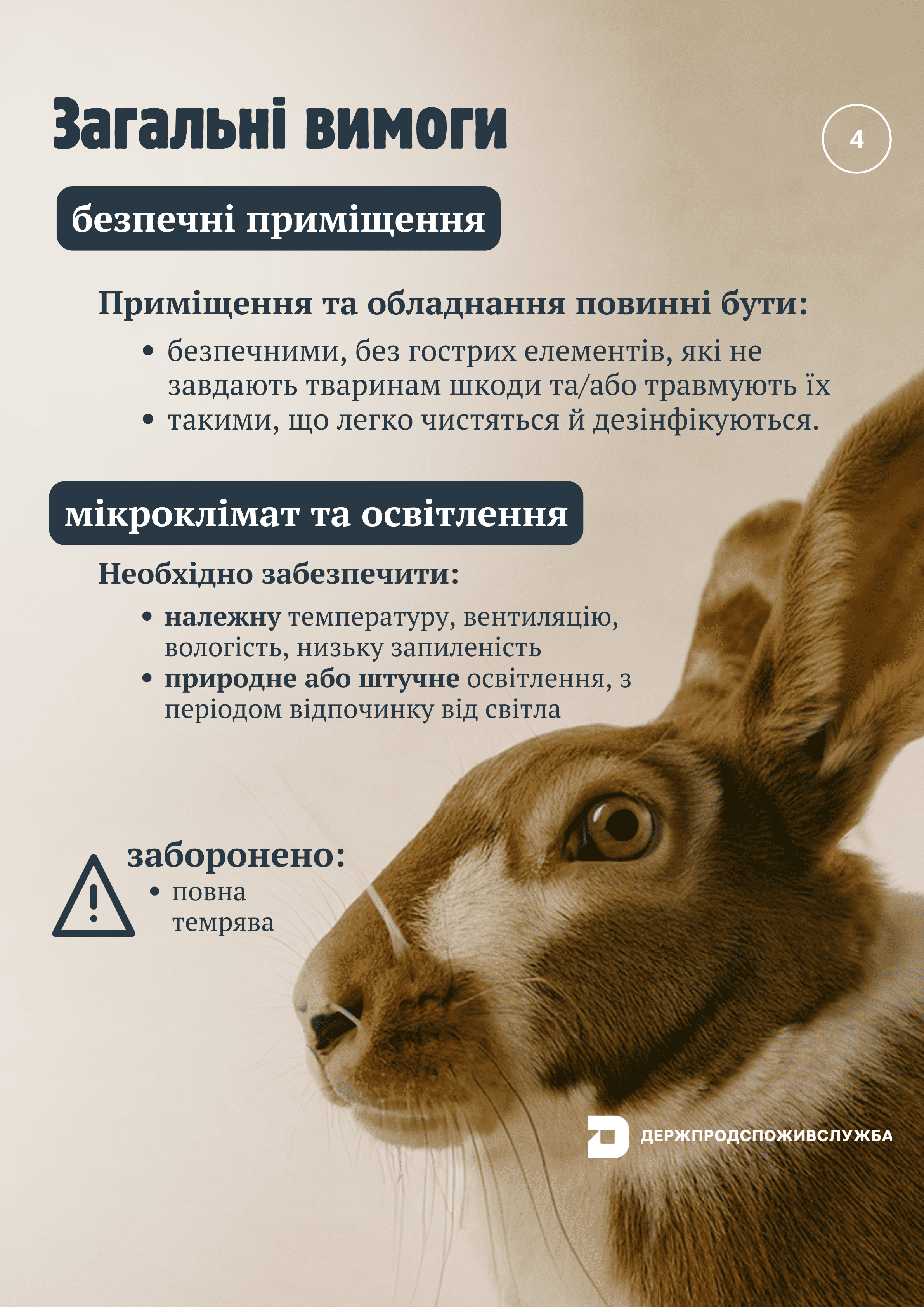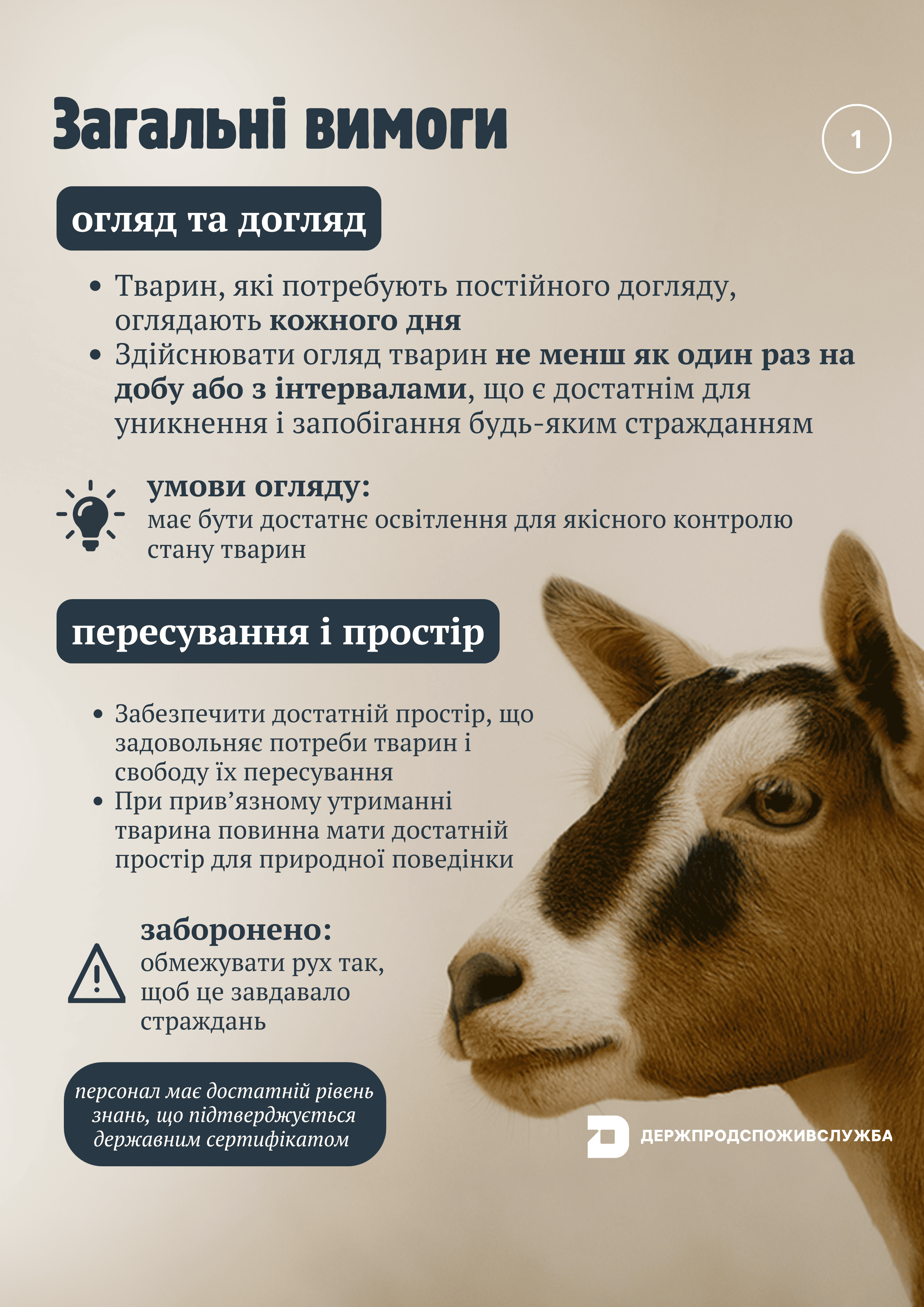 - Умови утримання: Приміщення, де утримуються тварини, повинні бути чистими, сухими, забезпечувати достатньо місця для руху та відпочинку, а також захищати від екстремальних погодних умов.